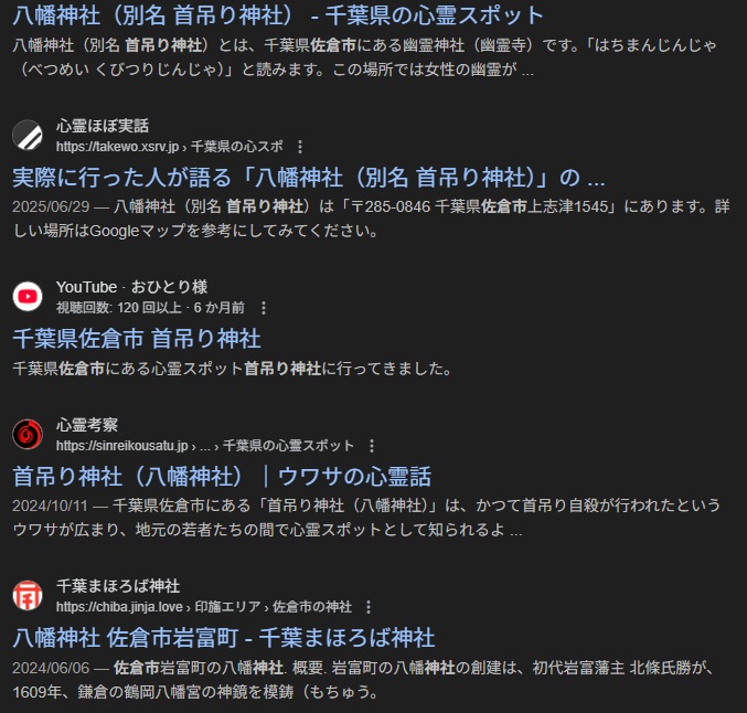 佐倉市には「首吊り神社」という通称で知られる心霊スポットがあり、正式名称は八幡神社(はちまんじんじゃ)です。