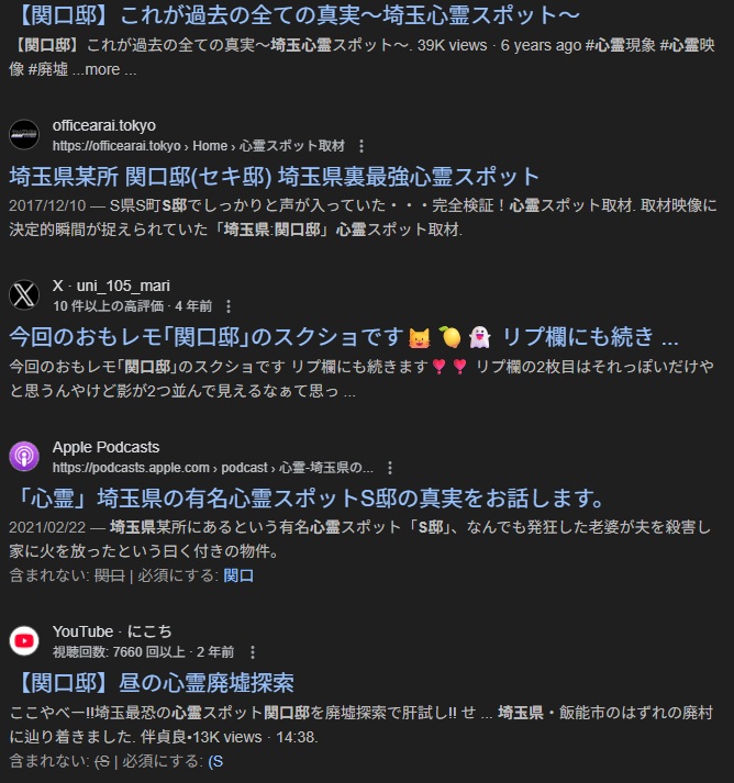 心霊スポットとしての「S邸」: 埼玉県に存在する「S邸」は、「発狂した老婆が夫を殺害し、家を焼いた」という内容の凄惨な事件の噂が根強く残る心霊スポットです。