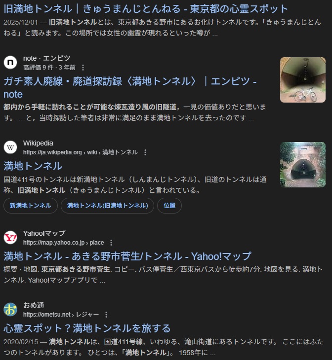 旧満地トンネル(満地トンネル)は、新トンネルとは別に残された古いトンネルで、その薄暗さや寂れた雰囲気から「心霊スポット」としてネットなどで話題になっており、特に夜間には女性の霊の目撃談や不気味な物音(鈴の音など)の噂があり、廃トンネル特有の恐怖体験談が寄せられることが多い場所です。実際には、暗闇による心理的効果や、歴史的な背景から様々な話が生まれやすい傾向にあります。