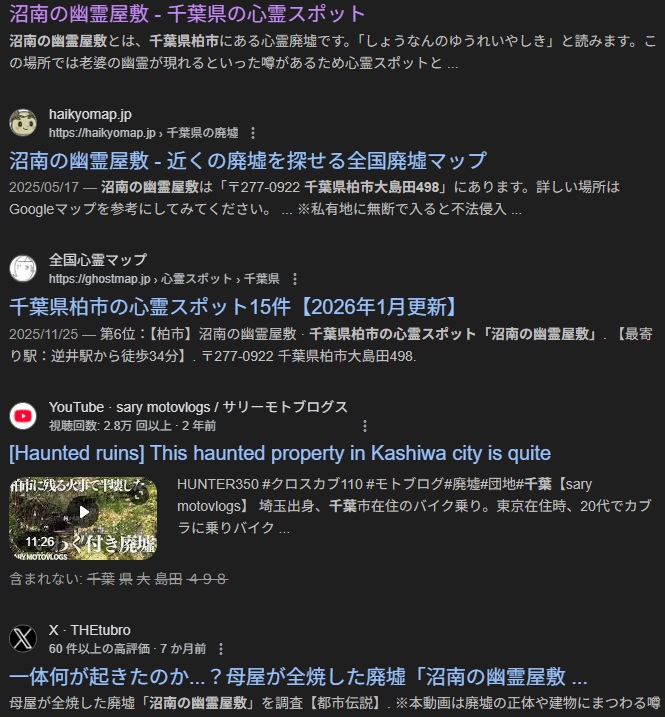 「幽霊屋敷」に関する情報は一般的な都市伝説やインターネット上の噂である可能性が高く、特定の裏付けとなる情報は見当たりませんでした。