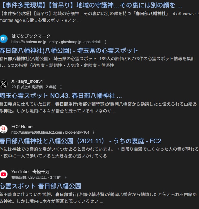 春日部八幡神社(および隣接する八幡公園)は、一部のウェブサイトで埼玉県の心霊スポットの一つとして紹介されています。