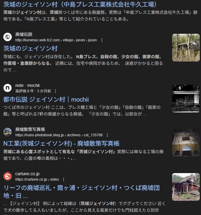 つくば市内の候補: 特定の公式な場所はありませんが、過去につくば市周辺の古い廃屋や山間部の建物がネット掲示板などで「ジェイソン村」と呼ばれた例があります。ただし、これらはあくまで噂に基づいた俗称です