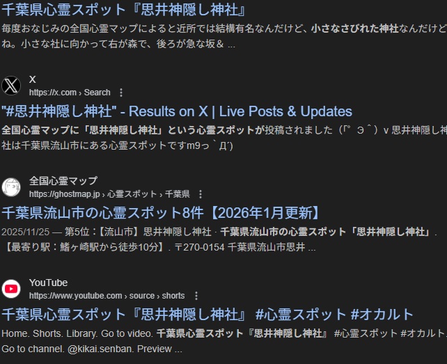 思井神隠し神社は、心霊スポットとしてインターネット上で話題になっている千葉県流山市思井にある熊野神社の通称です。古くから神隠しの伝承で知られる「八幡の藪知らず」(千葉県市川市)のような禁足地に関する話と混同されている可能性もありますが、この神社自体もいくつかの心霊現象の噂があります。